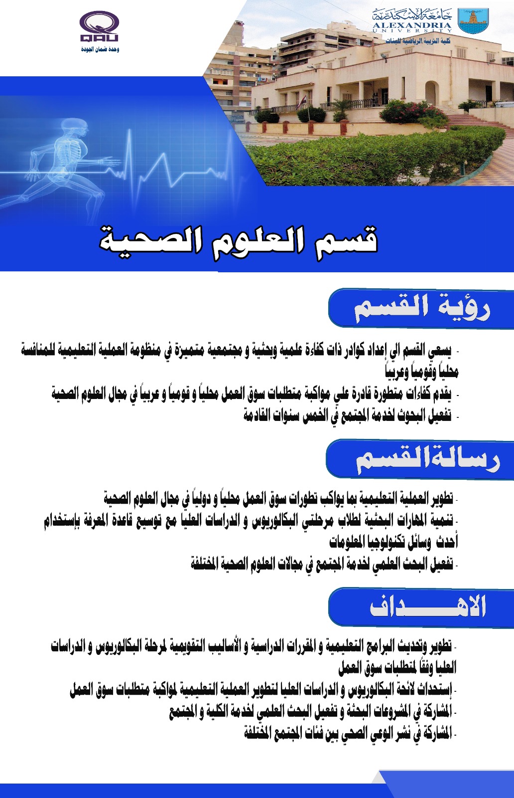 العلوم الصحية العلوم الصحية رؤية ورسالة واهداف قسم العلوم الصحية رئيس القسم الحالى أ.م.د/ شيماء السيد ابراهيم الجمل الروئساء السابقين أ.د/ دولت عبد الرحمن عبد القادر. أ.د/ ثناء فؤاد أمين حسنين. أ.د / امال شفيق 23 كانون2/يناير 2016 الزيارات: 7067